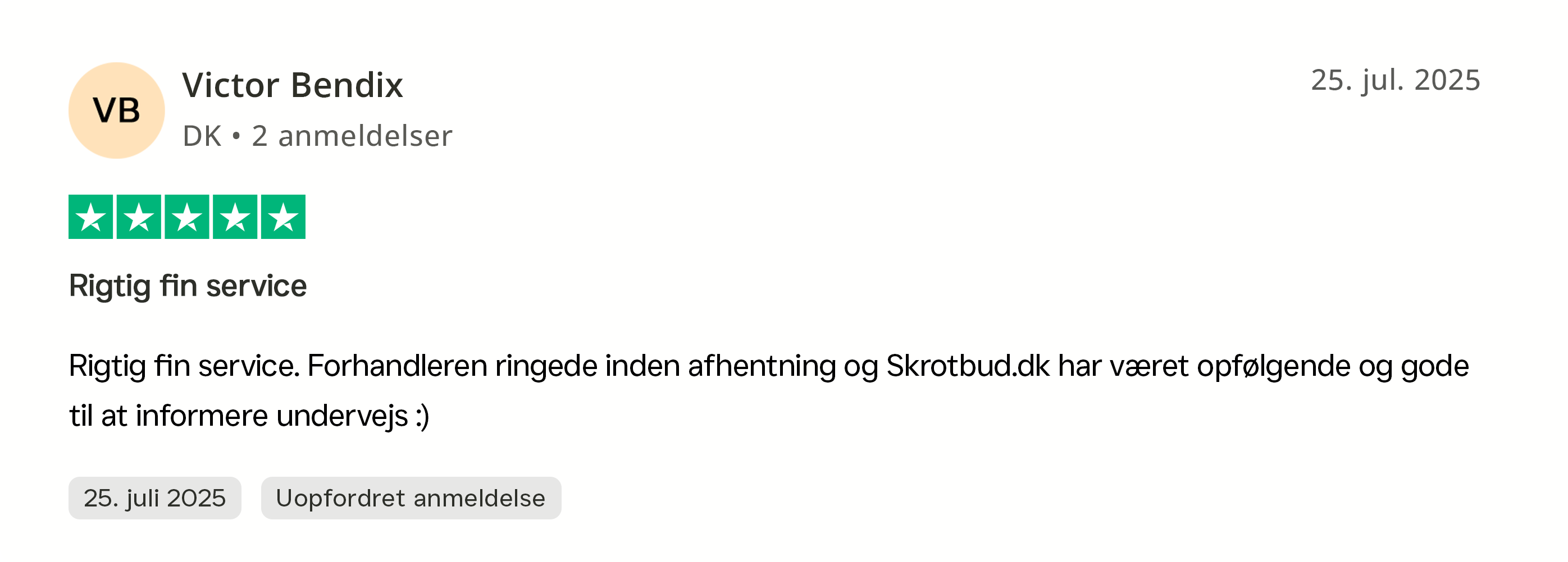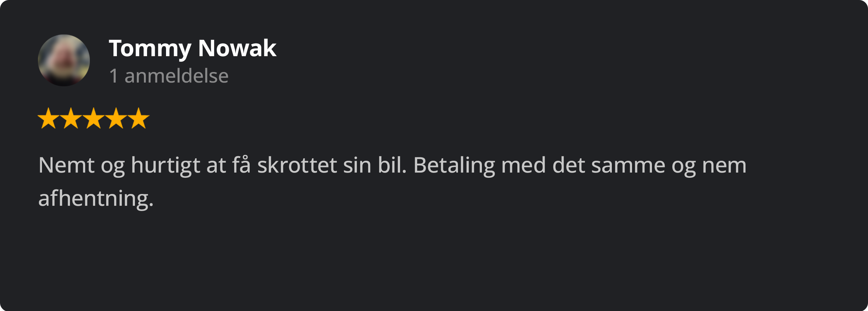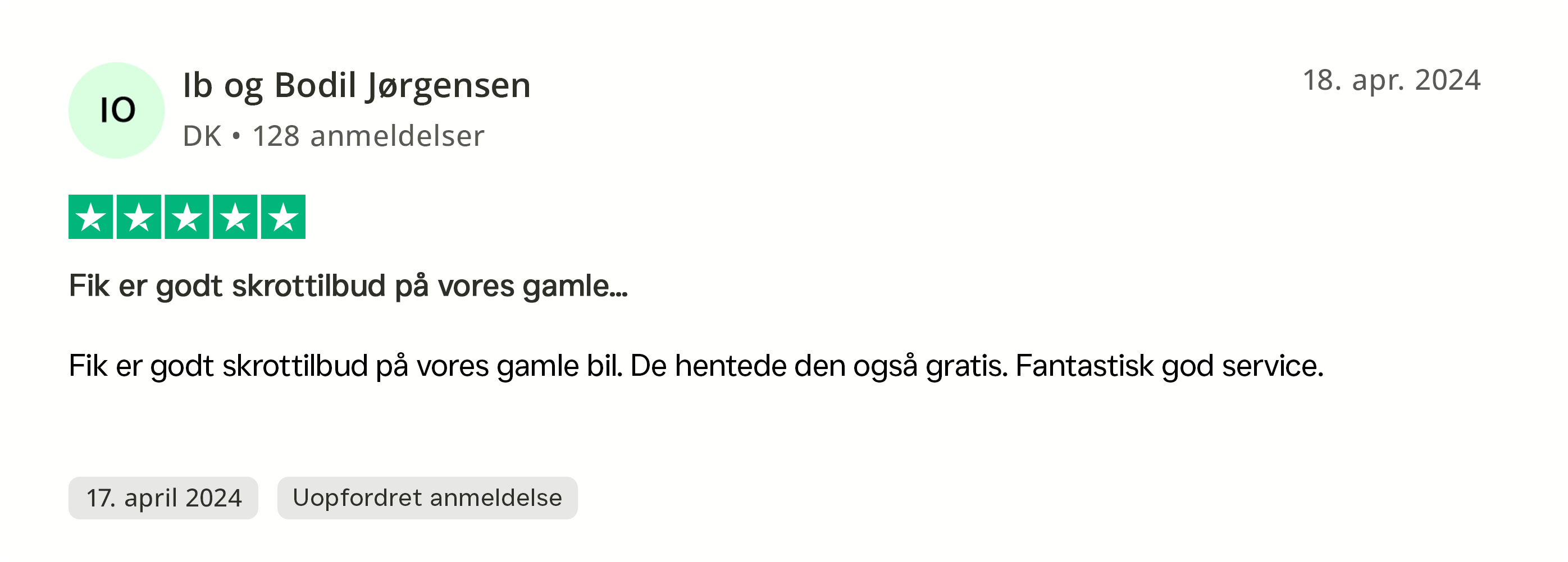 Min lokale ophugger havde tilbudt mig 2200 kroner i skrotpris for bilen og jeg tænkte at det var tiden værd at give skrotbud et forsøg. Jeg udfyldte formularen søndag aften og blev ringet op af Camilla dagen efter. Det bedste tilbud lød på 4000 kroner med gratis afhentning oveni. Jeg takkede ja og fik hentet bilen dagen efter. Ophuggeren fik klaret papirarbejdet på en ipad og jeg fik både penge og kvittering på stedet. Jeg vil klart anbefale at give skrotbud et forsøg. Hele processen gik smurt og jeg sparede også en god sjat på gratis afhentning.